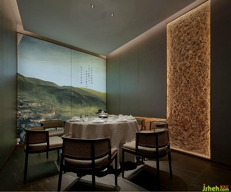 傳統(tǒng)手工藝制品是民間智慧和生活溫度的結(jié)晶。來自山中的藤類植物,經(jīng)由粗糙卻靈巧的雙手,成為隨處可見精美的盛具器皿。網(wǎng)格藤椅、卡座后方的藤編裝飾、明檔上方的藤編弧形隔板,傳統(tǒng)工藝品與現(xiàn)代設(shè)計材料結(jié)合混搭,得到重生。餐廳設(shè)計呼應(yīng)“遷移”和“融合”的客家文化主題。