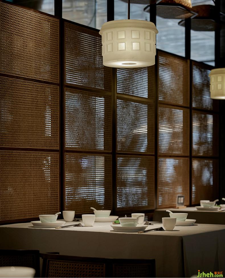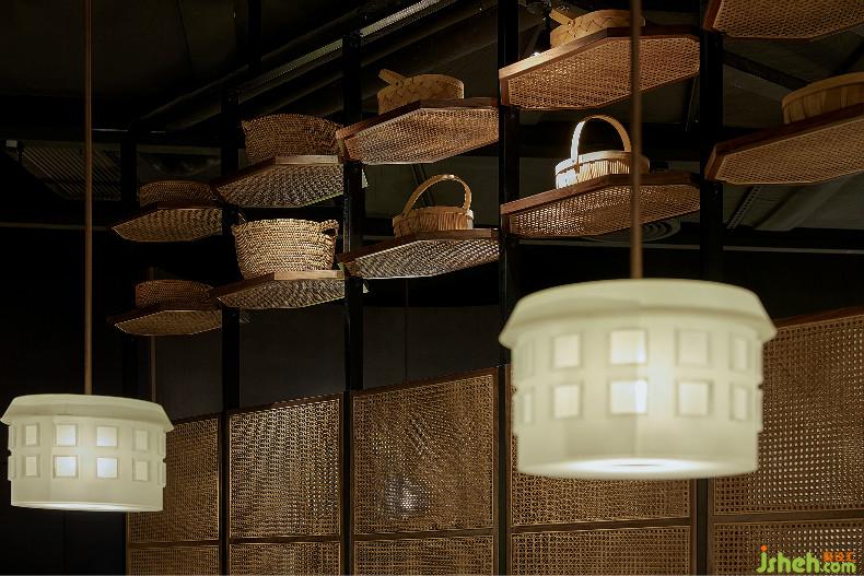 有山設(shè)計還創(chuàng)意性地將客家藤編工藝元素運用于餐廳隔斷,空間網(wǎng)格藤編屏風輕巧切割,室內(nèi)燈光通過屏風網(wǎng)眼流動,影影綽綽間,私欲交談聲,顧客走動的身影都能讓人感受到生活的氣息。從經(jīng)緯縫隙中透出點點光亮,渲染出溫馨的就餐氛圍和難得人情味。