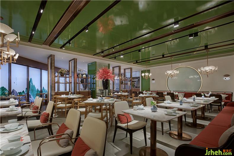 過狹長(zhǎng)的甬道,步入餐廳的瞬間視線豁然打開,別有洞天。飽和、濃郁的綠色紅色撲面而來,餐廳設(shè)計(jì)與陳設(shè)飾品的搭配使人眼前一亮,整個(gè)空間充滿活力,生機(jī)盎然。綠色的烤漆鋼板天花突破了在傳統(tǒng)湘菜餐廳中固有的色彩認(rèn)知,定制的折扇型的吊燈打破了空間的沉悶,成為視覺中心。