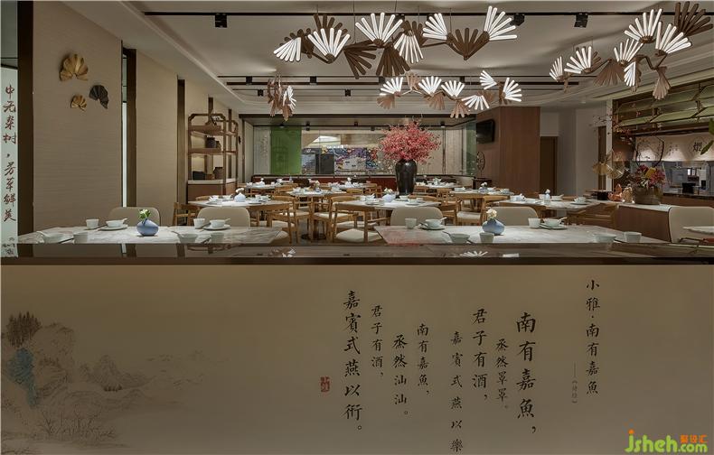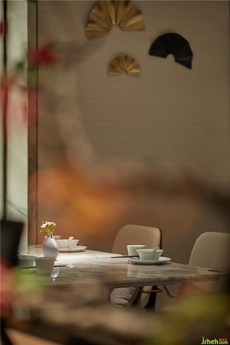 與之相呼應(yīng)的是墻面的搭配的扇面造型飾品和湖南著名景觀的照片墻,餐廳設(shè)計(jì)以及誤入桃花源的中國(guó)水墨畫無一不詮釋著創(chuàng)作的主線:為食客提供一個(gè)優(yōu)雅就餐的”世外桃源”。