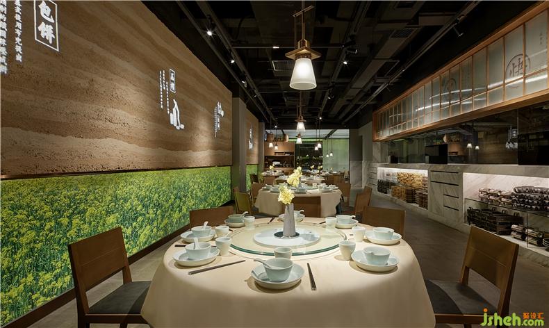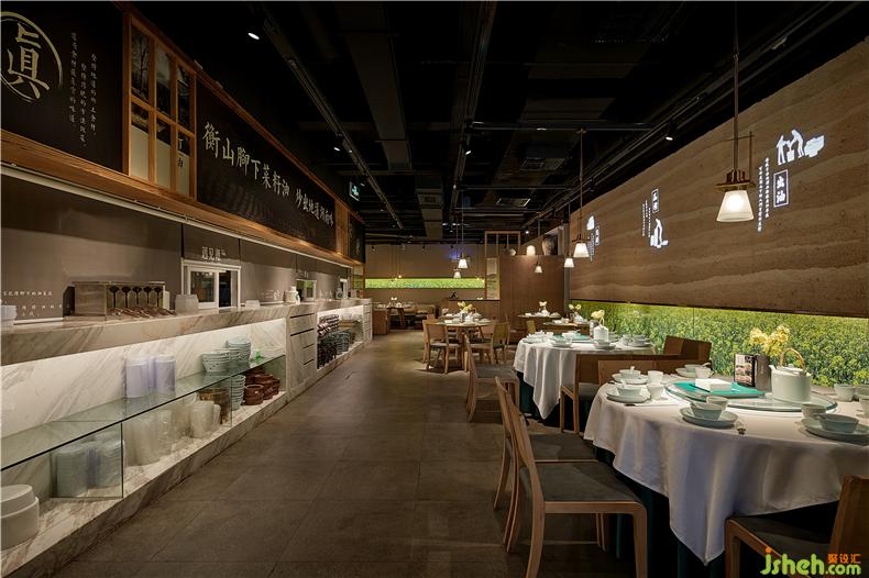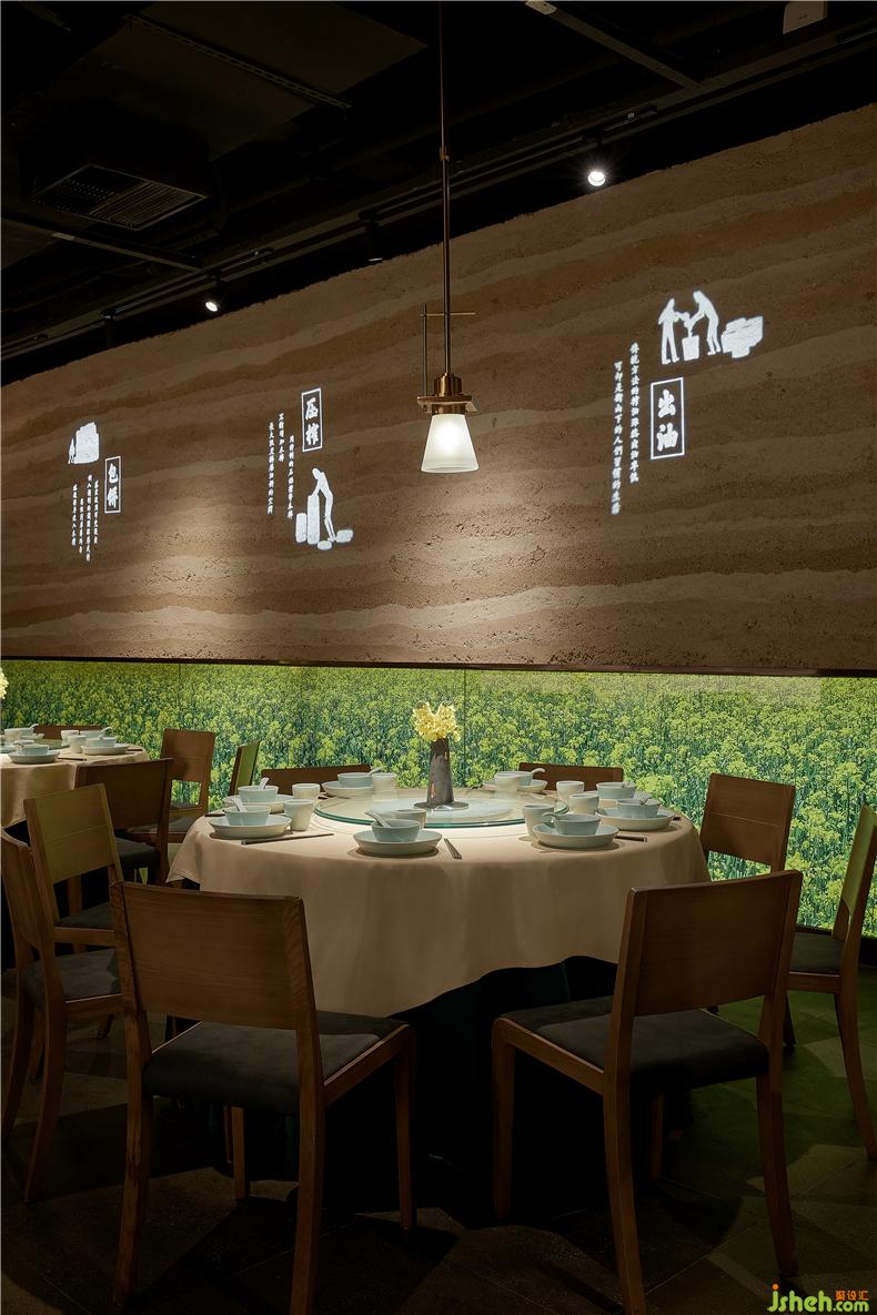 餐廳夯土墻上的投影重現(xiàn)衡山鄉(xiāng)下的榨油場(chǎng)景,與背景墻、食材介紹相映成趣。餐廳設(shè)計(jì)