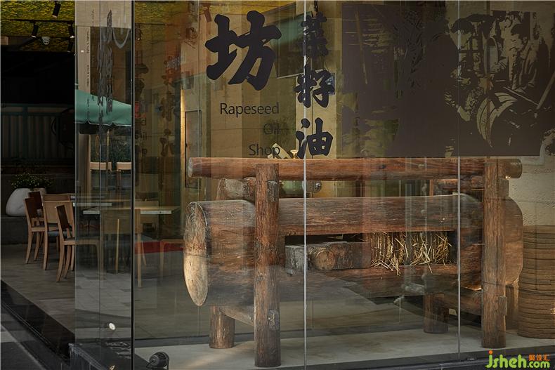 初至「遇見(jiàn)湘」祈福店,一片金燦燦的油菜花海充滿(mǎn)眼簾并延伸室內(nèi),門(mén)前花海下放置著一具手工木質(zhì)古法榨油機(jī),兩側(cè)整齊地堆疊著菜籽油餅,吸睛的同時(shí)力圖傳遞出匠心、傳承的理念,餐廳設(shè)計(jì)也通過(guò)這兩個(gè)代表性的符號(hào)傳遞出定位的訴求:衡山腳下菜籽油,炒出地道湖南味。