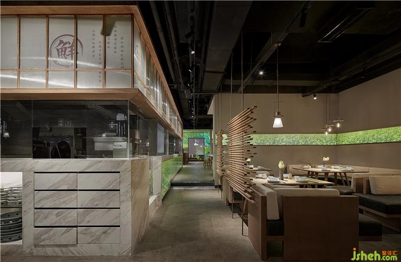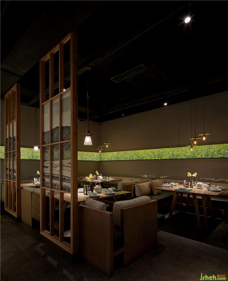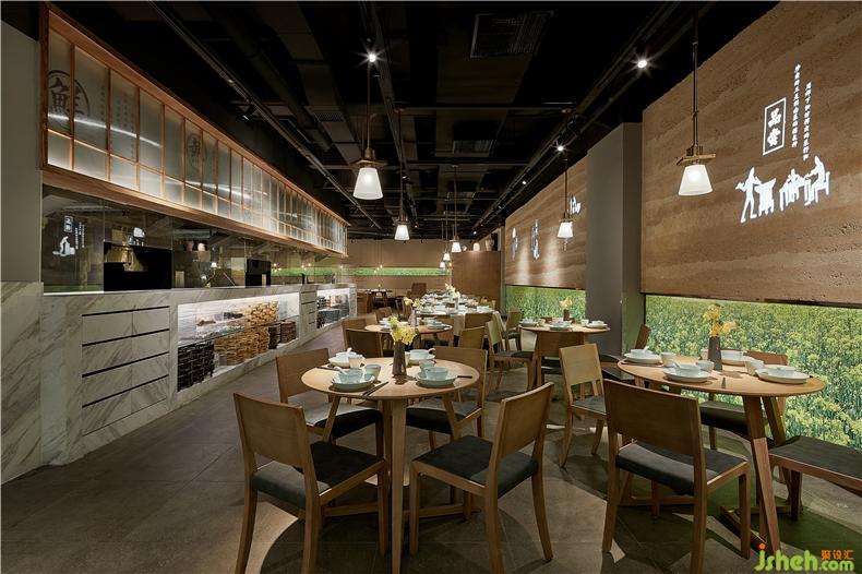 開放式明檔是店內(nèi)重要的展示舞臺(tái),每一個(gè)灶臺(tái)的廚師都是主角。上方的紗幔上“鮮、熱、真、火、快”五個(gè)大字映入眼簾,道出衡陽小炒功夫的精髓。明黃色的吊燈組渲染干凈溫馨的餐廳氛圍,而蒸騰的鍋氣試圖喚醒你回憶里故鄉(xiāng)的裊裊炊煙,廚師烹飪過程一覽無余,菜籽油混合小炒肉的香氣撲鼻而來,塑造出餐廳的獨(dú)特氣息,勾人食欲,餐廳設(shè)計(jì)使食客可以充分領(lǐng)略到衡陽小炒“食”與“境”的美妙關(guān)系。