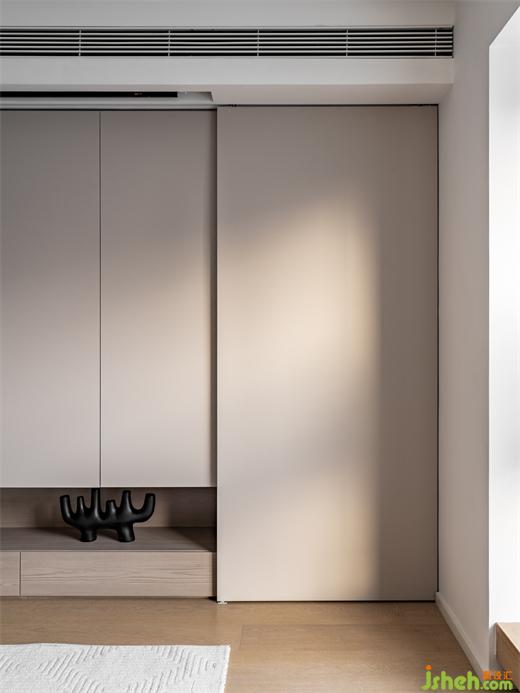 客廳沒有放置電視,海境界家裝設(shè)計主墻做了一大面儲物柜,可以收納很多家庭雜物以及小孩的書籍玩具,兩側(cè)為兩扇大的推拉柜門,小孩拿書籍玩具會比較方便,頂部中央空調(diào)處有安裝投影幕布,雖然沒有電視偶爾看看電影還是很舒適