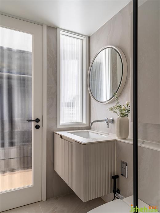 衛(wèi)生間結構調整后,原窗戶在衣帽間里,為了增加采光在衛(wèi)生間門邊設計了一個內窗,與衛(wèi)生間門呼應