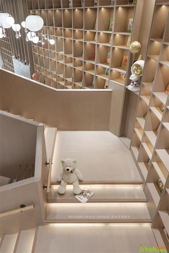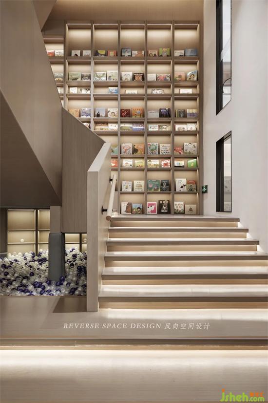 The staircase not only connects the upstairs space, but also serves as a reading and communication area for children.