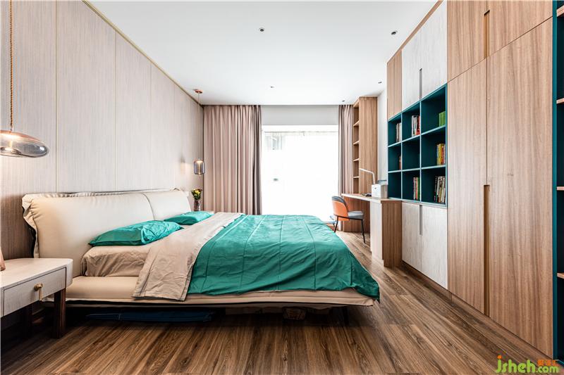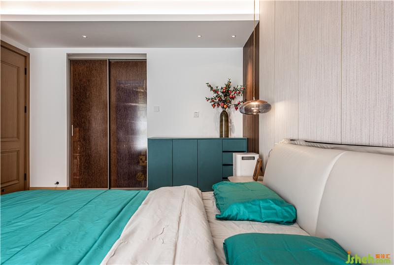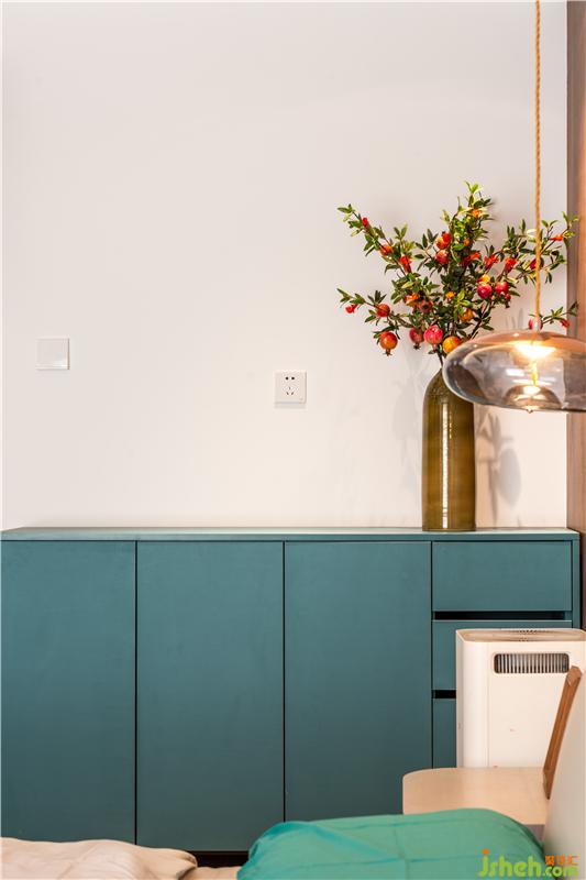 整體設計以現代簡約風格為主,在空間色彩搭配中我使用了搶眼的孔雀藍,配以部分橙色家具為點綴,以此凸顯女主的藝術身份!