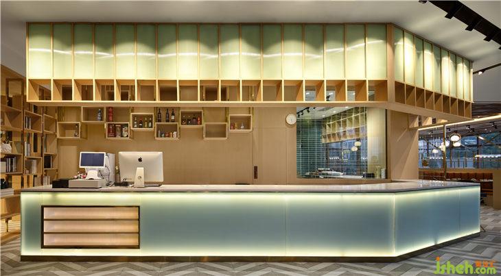 吧臺區(qū)域+吧臺區(qū)通過色彩的組合,冷暖對比強調(diào)服務(wù)功能區(qū)位的劃分