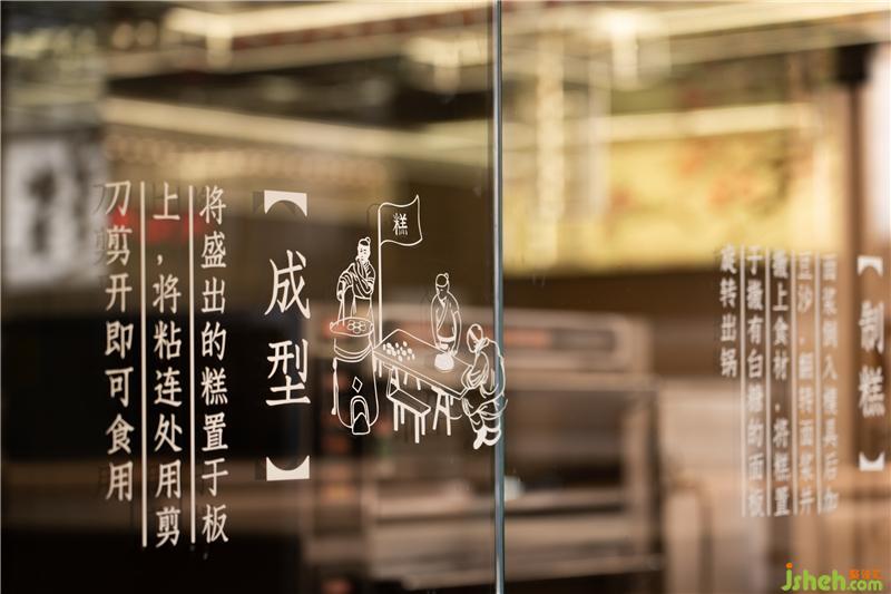 黃天源作為2009年江蘇省首批“非物質(zhì)文化遺產(chǎn)”傳統(tǒng)糕團(tuán)制作技藝的品牌,理應(yīng)在其空間場域來傳承其制糕工藝?!胺沁z展示區(qū)”的玻璃面上,一道道制糕工藝,躍然于空間,讓其看不見的工藝得以重現(xiàn)傳承。