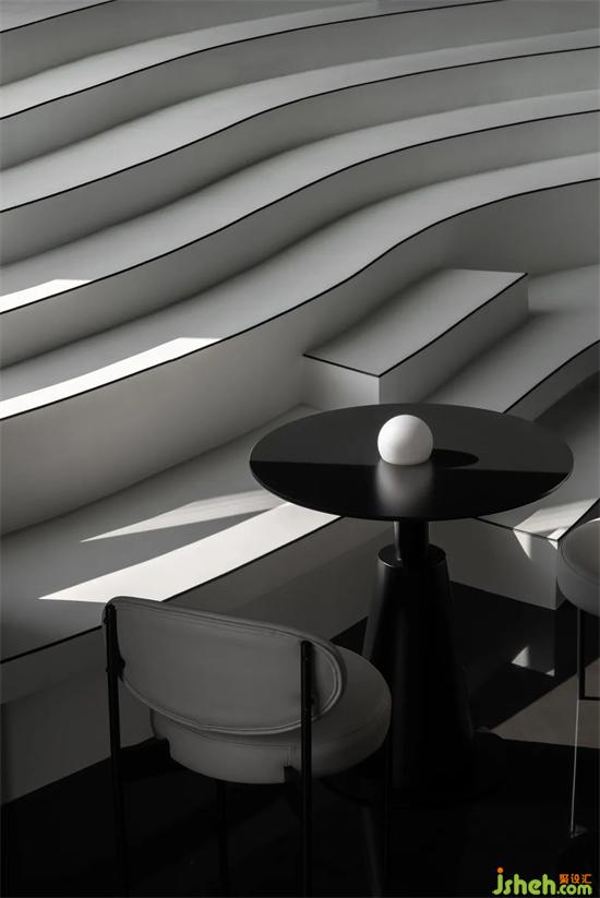 The whole space is divided into two parts: the iceberg and the water surface. The iceberg part is based on the shape of the iceberg, which is divided into steps. The black mirror simulates the water surface, and the black mysterious temperament is consistent with the lake.The reflective effect of the mirror simulates the feeling of reflection on the water surface, presenting a very subversive space.