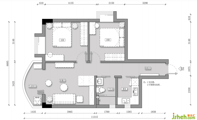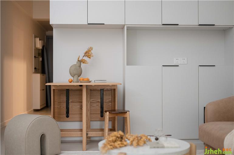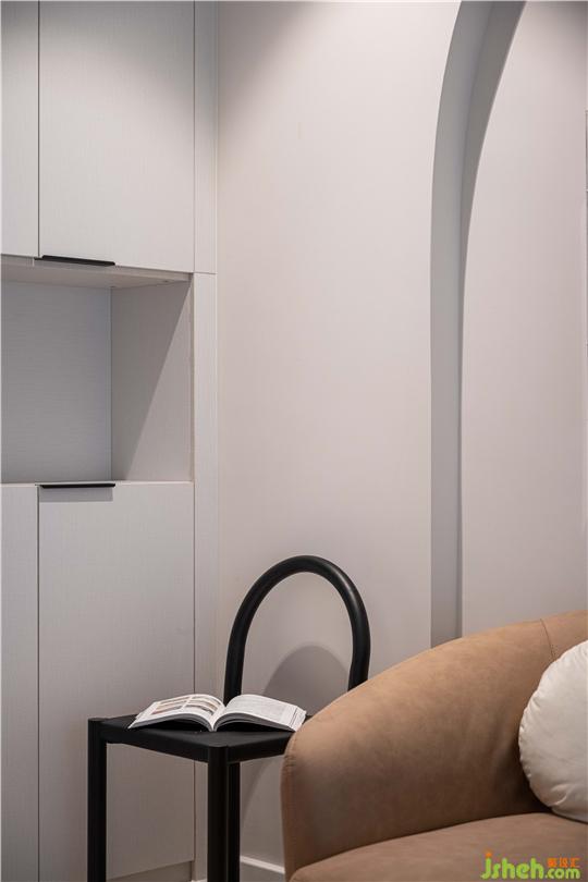 主人房也是跟客廳一樣,有一條梁柱在床的左側(cè),廣州舊改設(shè)計為了改善這個問題,我們做了一個半拱形,既不影響衣柜的位置,也不影響床的尺寸。再結(jié)合半圓的油畫掛飾和橢圓的床頭燈,讓硬裝的形態(tài)和軟裝的元素相呼應(yīng)。