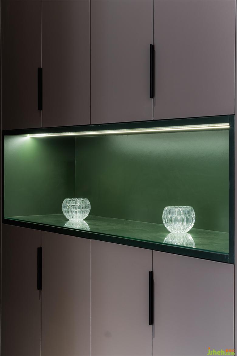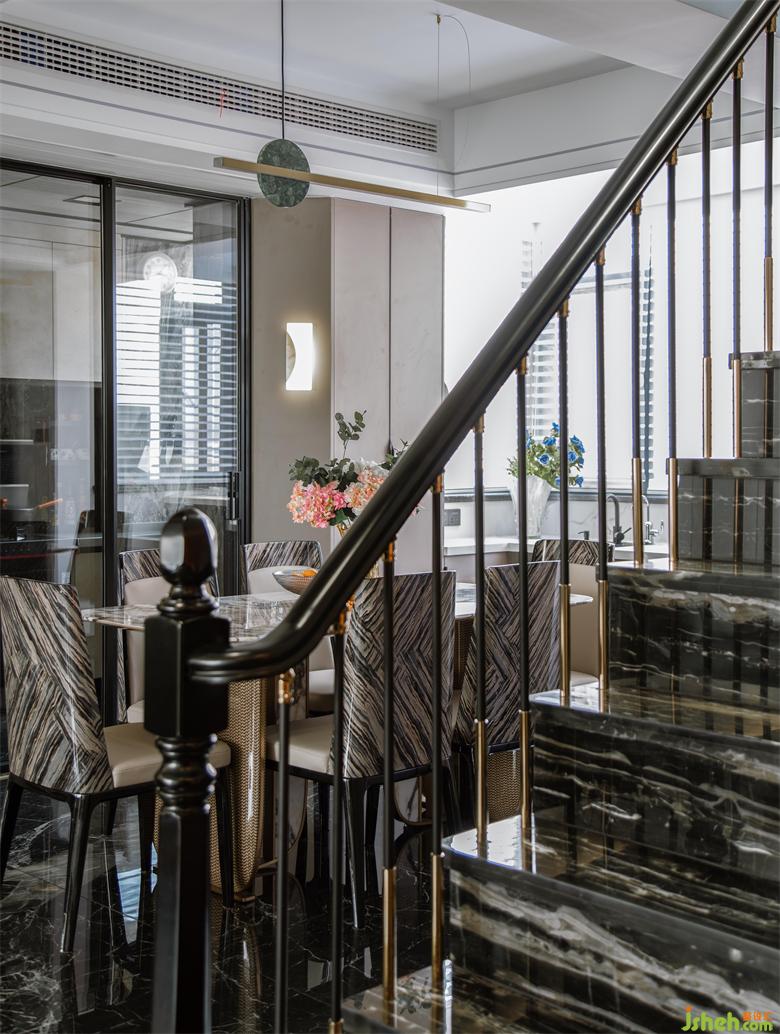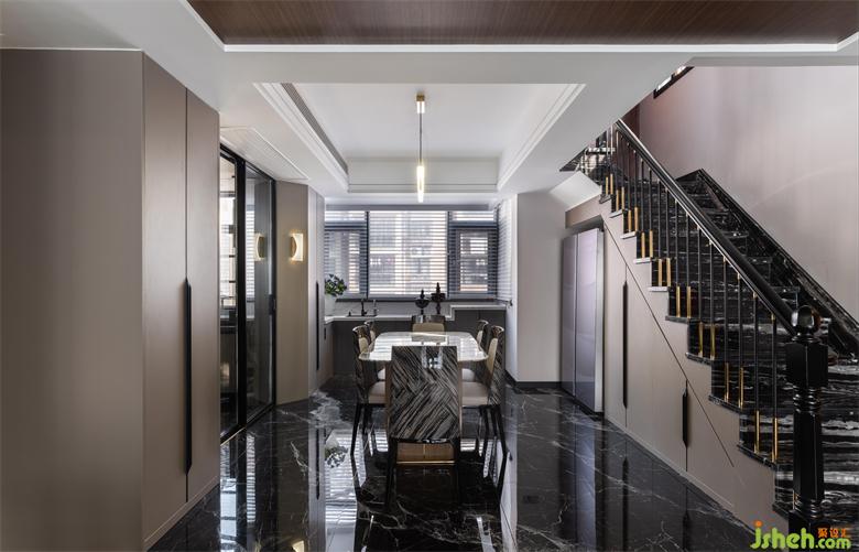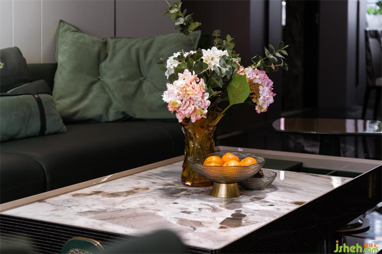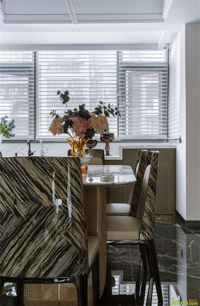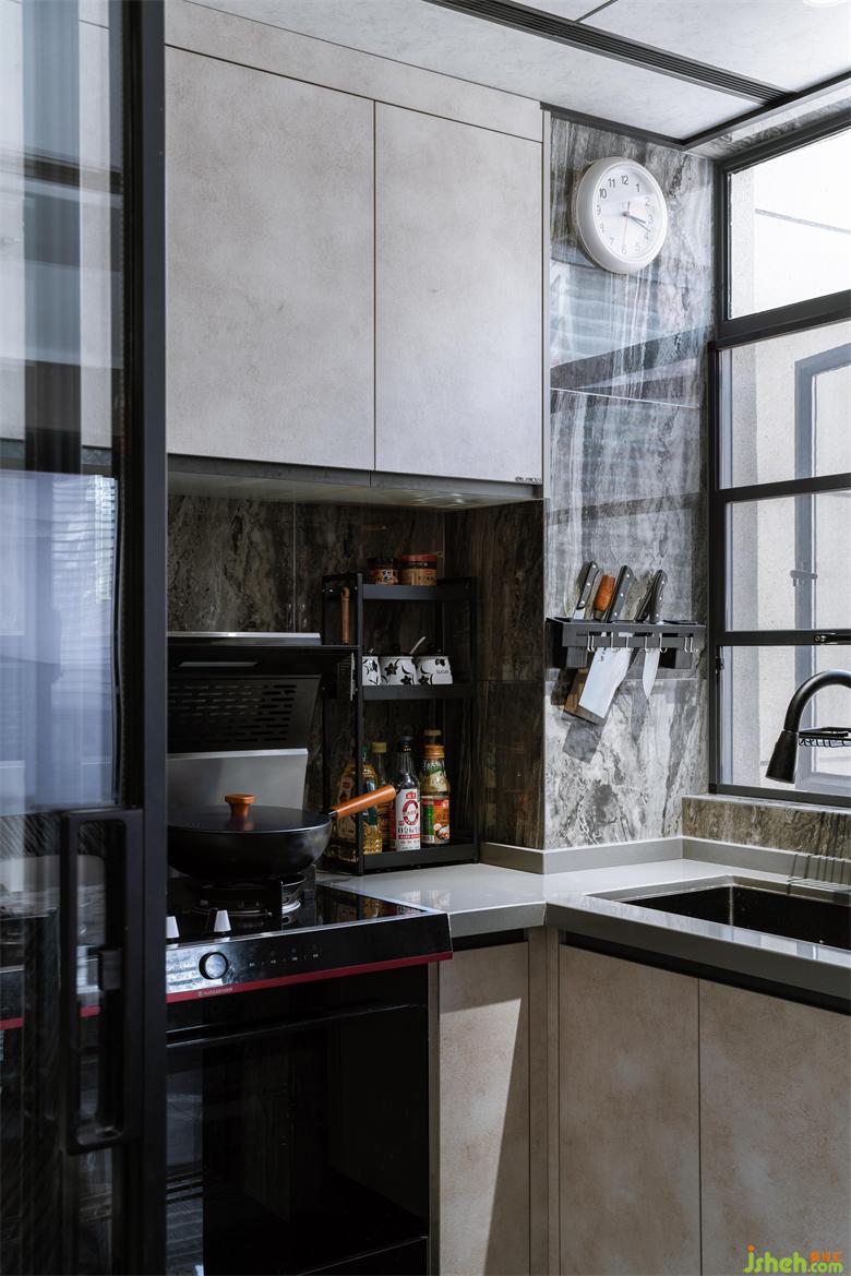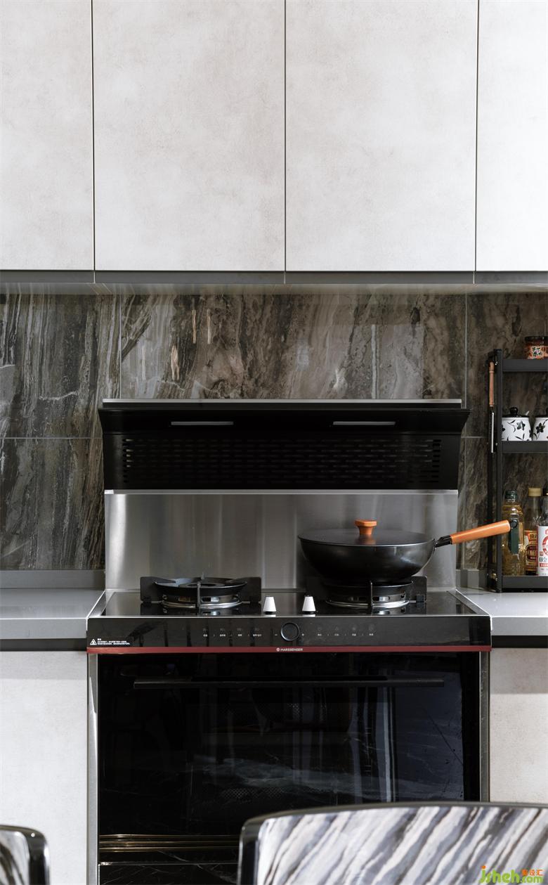 利用酒柜厚度彌補了餐廳與客廳抽線不水平,空間不方正的問題。斜角的設(shè)計讓空間變得活潑,有處理。花園家居設(shè)計增加的操作臺面大大提升了烹飪的時效。