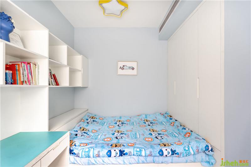 兒童臥室,淡藍(lán)色系無(wú)疑是最大亮點(diǎn)了,孩童時(shí)代,藍(lán)色代表童真美好與純潔,書(shū)柜兒童書(shū)桌有效融入空間,不突兀,藍(lán)色雕塑擺件,又一次體現(xiàn)了藝術(shù)的氛圍感。