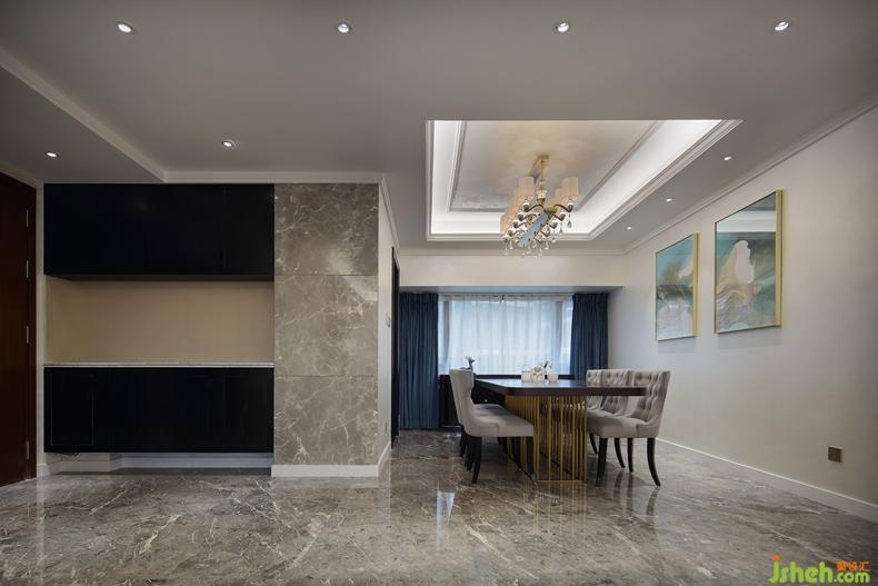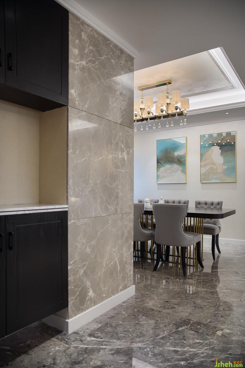 本案,大廳地面采用灰色大理石,帶動(dòng)整體色調(diào),深檀色飾面點(diǎn)綴局部空間,餐桌對(duì)應(yīng)第二色塊,墻面采用進(jìn)口壁材,以淺灰色銜接大理石墻面,營造空闊寧靜的餐廳空間。