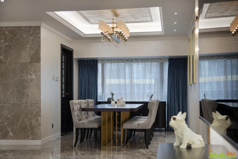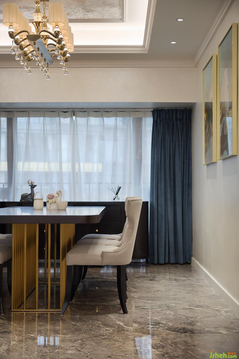 餐廳窗簾以蔚藍(lán)色為主,在天花與地面之間勾勒出一抹藍(lán),分割天與地。室內(nèi)設(shè)計(jì)師