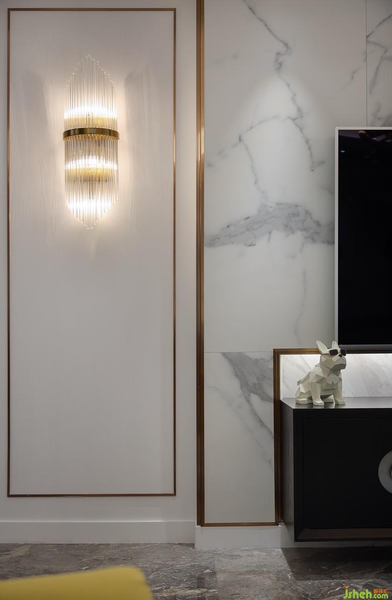 電視背景也采用金屬點(diǎn)綴,定做的水晶壁燈,搭配精致的不銹鋼邊