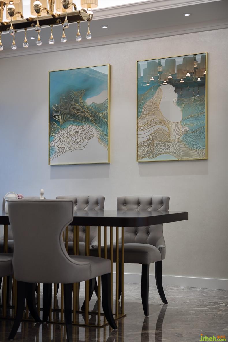 燈具與掛畫邊框,餐桌金屬腳也是相互呼應(yīng),融為一體