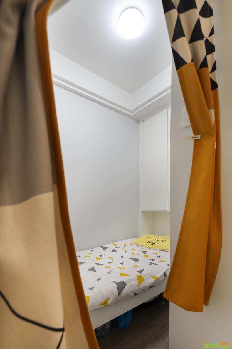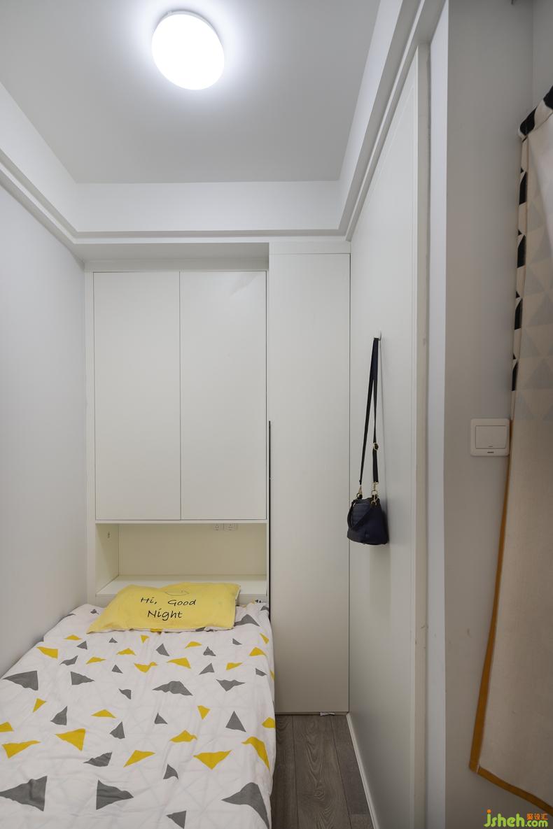 長輩房的空間也是一寸沒有浪費,掛包包的其實是鞋柜的背板,儲物柜也是屬于比較大了,中空部分是把床底下部分的柜體也利用了起來。