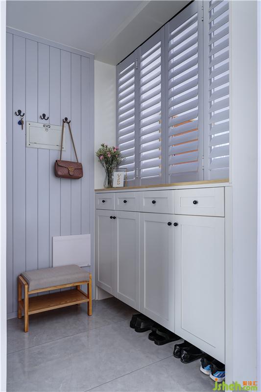 原有入門處并不能合理的放置鞋柜,設(shè)計(jì)師通過(guò)改造客廳,增置了一個(gè)入戶鞋柜,解決鞋子收納問(wèn)題;鞋柜亦充當(dāng)玄關(guān)與半開放式活動(dòng)室的軟隔斷,進(jìn)門便能透過(guò)百葉窗也能感受親子時(shí)光。裝修公司
