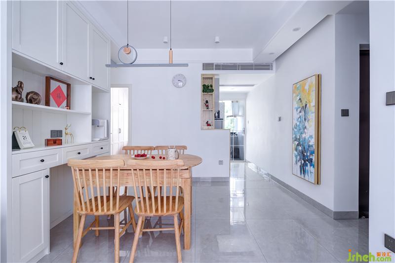 改變了原有餐廳設(shè)置在過(guò)道盡頭處的做法,改成了與客廳對(duì)接,客餐廚空間緊密聯(lián)系又戶型獨(dú)立,動(dòng)線流暢;并增設(shè)餐邊柜,增加儲(chǔ)存收納空間。