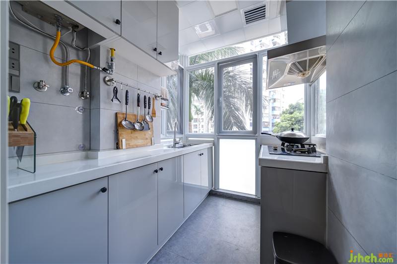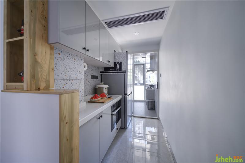 利用空間的優(yōu)勢(shì),設(shè)計(jì)師將利用率極低的生活陽(yáng)臺(tái)改造成中廚,并增置了西廚,延伸至走廊處,優(yōu)化空間設(shè)計(jì),增加家長(zhǎng)和小朋友互動(dòng)的空間。