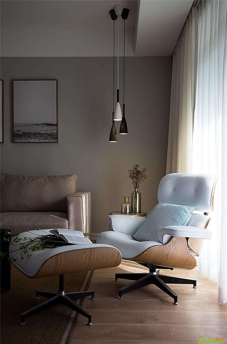 客廳的一角,伊姆斯躺椅和黑白灰吊燈的組合,大空間的色調(diào)是溫暖的灰色和白色紗簾為主調(diào),點(diǎn)綴溫暖的淺木色家具,整體感覺安靜舒適,充滿時(shí)尚干凈的北歐格調(diào)。