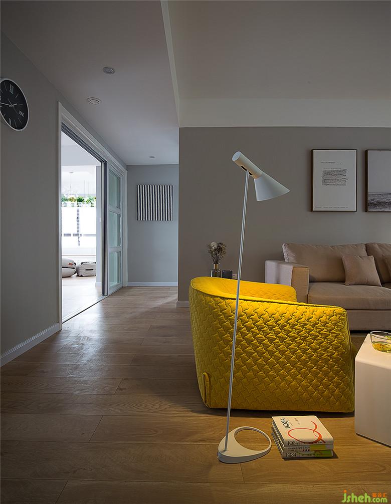 客廳的另一側(cè),搭配了一款亮黃色的沙發(fā),整體帶來年輕明快的節(jié)奏。