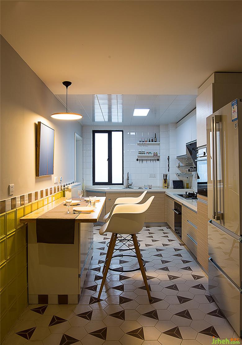 餐廳和廚房合二為一,中島后面合理安排了電器柜,冰箱烤箱、洗碗機(jī)……一應(yīng)俱全。