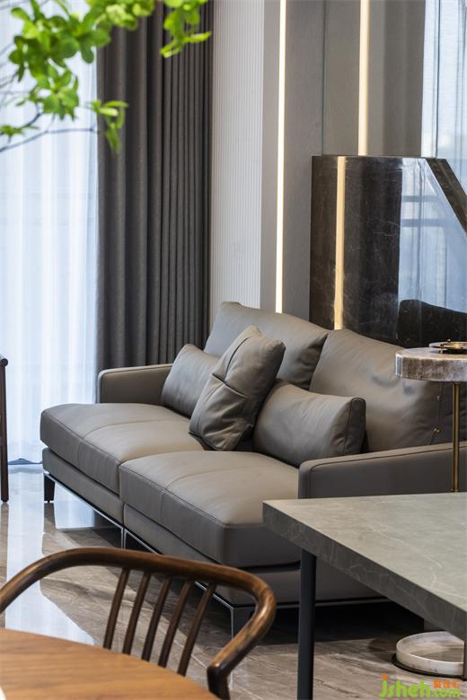 The smooth design lines have no redundant decoration, the multi-seat Leather Sofa feels comfortable, the gray slate TV background wall matches the black stainless steel low-key introverted, quite has the sense of texture, the order is orderly, then adds the dark green leisure chair slightly to embellish, breathe a little life into the space.