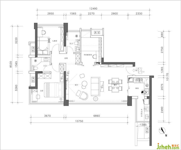 根據(jù)業(yè)主習慣,性格及喜好,硬裝上以簡單的黑白灰三大塊色系構建,家具用原木色襯托,軟裝上運用質(zhì)感強、色彩明亮的配飾相碰撞。在整個柔和的大空間中,明亮的顏色給家?guī)砹嘶钴S的視覺感受。