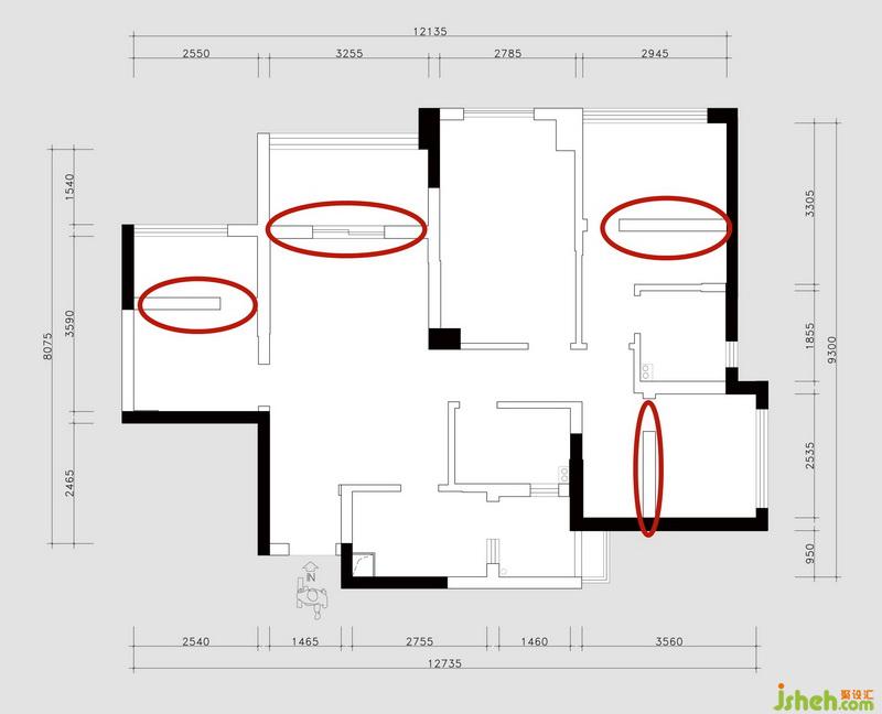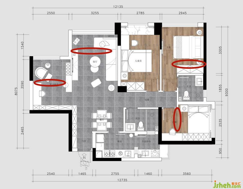 本套戶型方正,不好利用的空間少,且整體采光通風(fēng)較好。但是原廚房、餐廳及兒童房面積過(guò)小,無(wú)法滿足業(yè)主的日常使用要求,同時(shí)廚房和生活陽(yáng)臺(tái)的采光不好,使用不便。