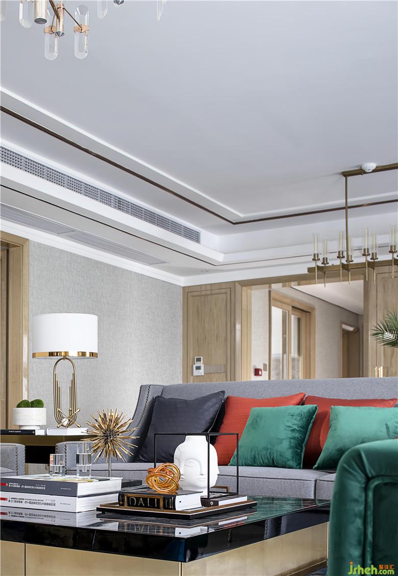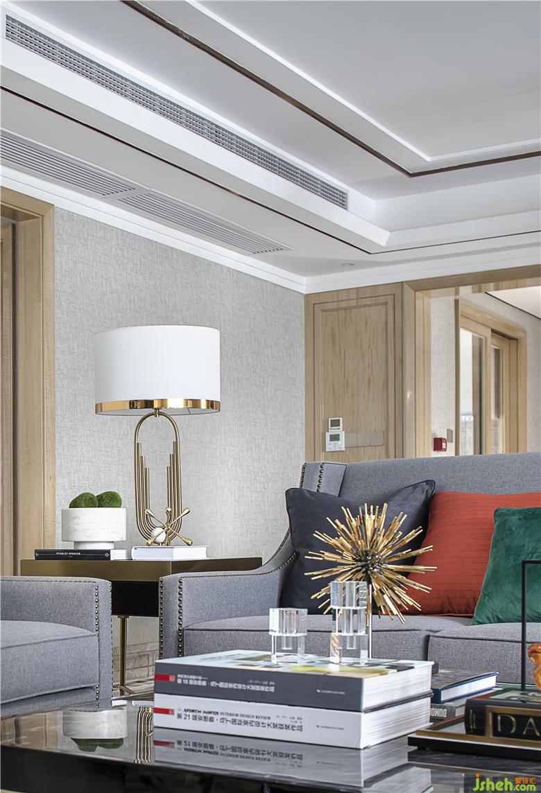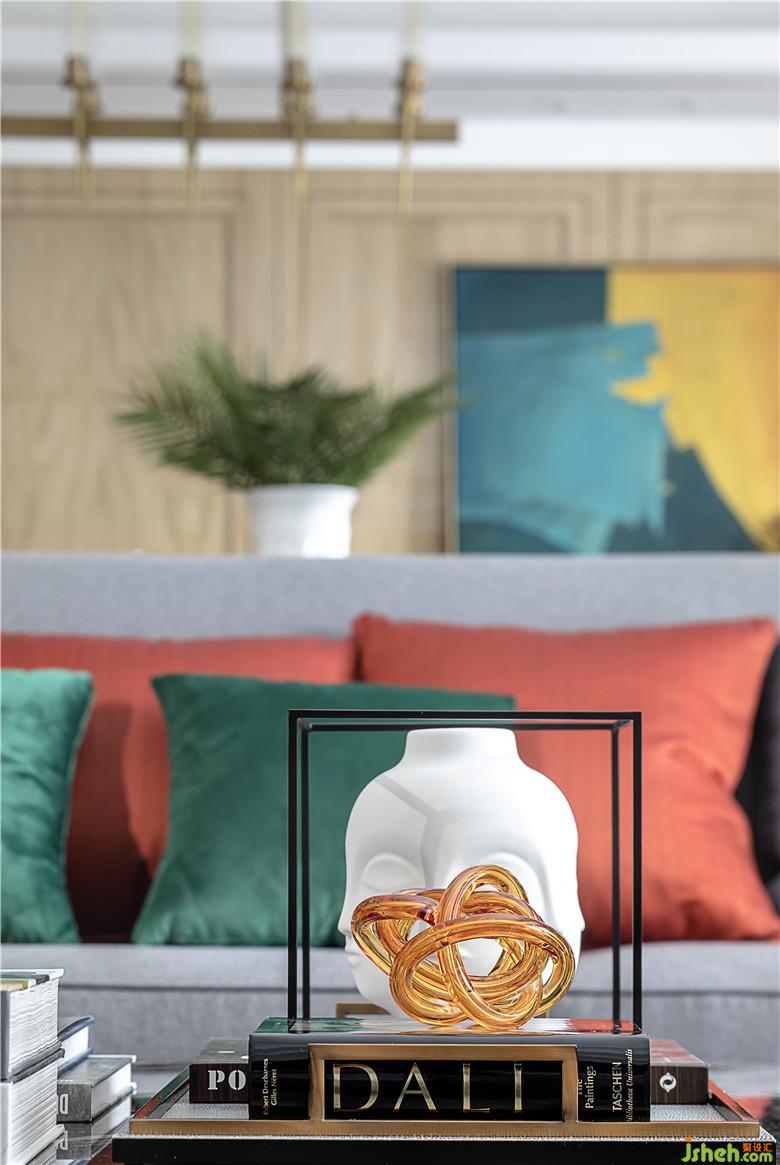 客廳室內(nèi)設(shè)計(jì)師以淺灰為主色調(diào),以黃銅搭配大理石演繹出高級(jí)質(zhì)感,極具魅力藝術(shù)的擺件,造型簡(jiǎn)約的抽象畫(huà),讓空間生生不息的生命力有了最具象的演繹。