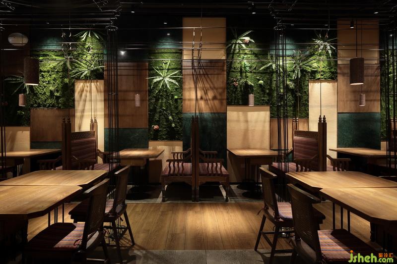 鐵藝的柱子有序的排列空間中,豐富了空間感,也營(yíng)造出若隱若現(xiàn)的私密感,柱子下燈光由下而上,增添儀式感。木、石、夯土構(gòu)成墻面對(duì)綠植墻進(jìn)行的分割,古樸的顏色和質(zhì)感,讓整個(gè)餐廳好似自然生長(zhǎng)于環(huán)境之中,氛圍自然而舒適。