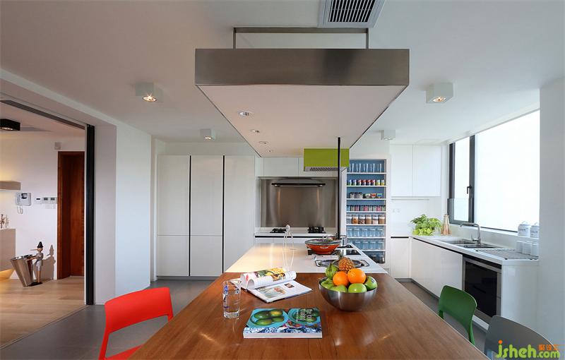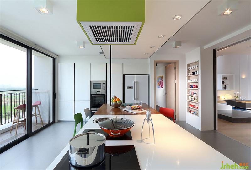 廚房以白色為基調(diào), 復(fù)式設(shè)計(jì)俐落摩登 , 再以紅色、綠色和青色點(diǎn)綴空間。