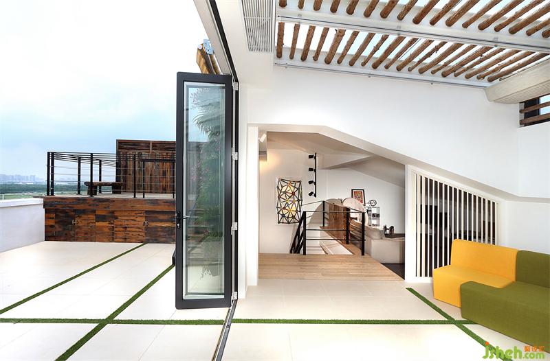 復(fù)式設(shè)計(jì)天臺(tái)的天窗由衫木和玻璃組成,燒烤享樂區(qū)則由船木打造,不同的木材讓空間更有層次感。