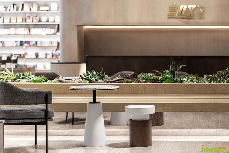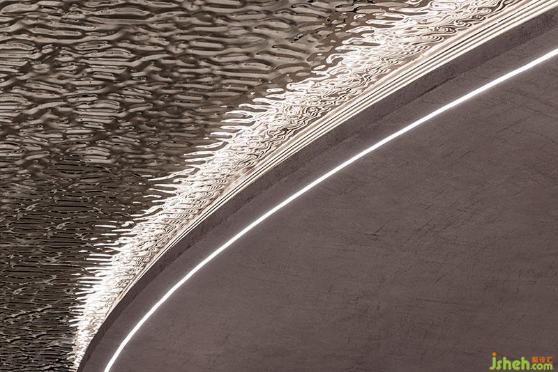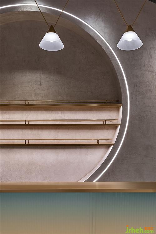 上空是水色漫天,如陽光傾撒海面,臺側藍黃漸變的波紋玻璃為空間帶來跳脫的感覺,形成一道流淌的風景。