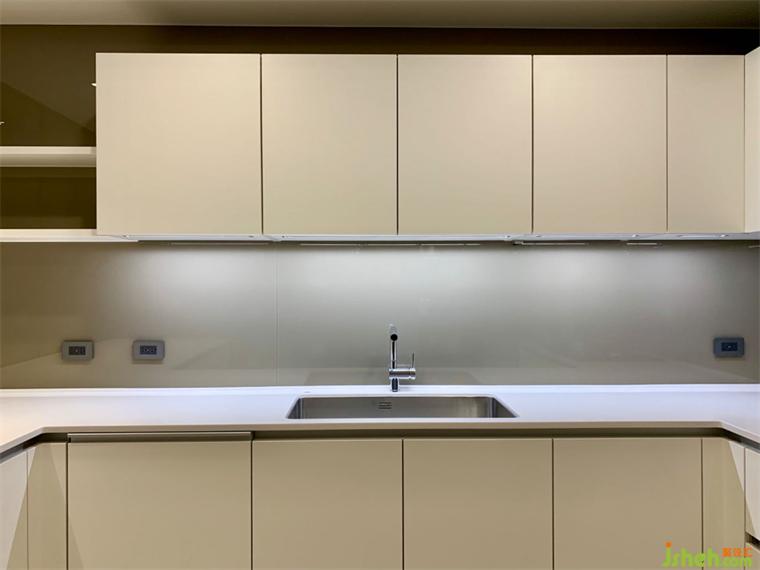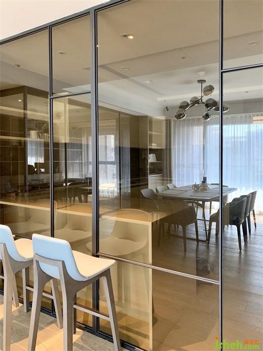 另外在廚房吧臺(tái)側(cè)墻設(shè)置了一道金屬框移門,透過(guò)移門的開(kāi)合創(chuàng)造出靈動(dòng)的空間組合,解決廚房的油煙問(wèn)題。
