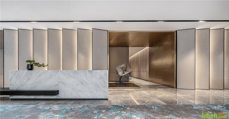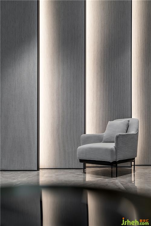 會所大廳立面通過序列感造型一字排開,燈光強化關(guān)系,嘗試營造整潔,平和的氣場。