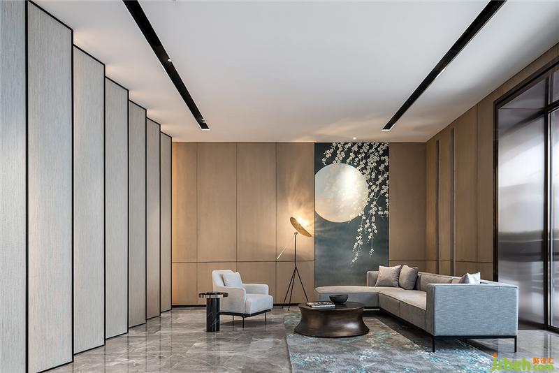 在燈具和藝術(shù)品的選擇上,都考慮扇的延伸元素“秩序,韻律,折疊,變形”