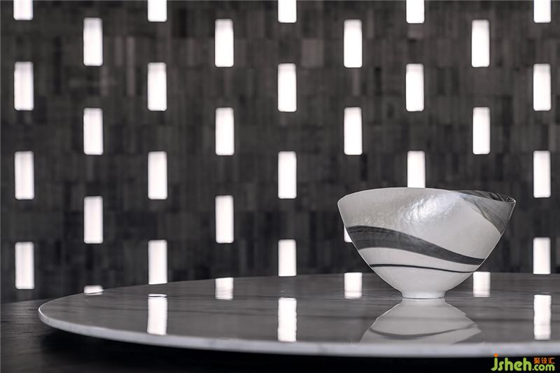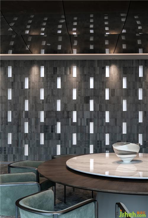 外立面鏤空的造型能讓光線進(jìn)到室內(nèi),如何引入光線也是思考的方向,磚的概念通過虛實(shí)的表達(dá)方式,青磚與玻璃磚的搭配,讓光有節(jié)制的穿透,營造戲劇性的光影氛圍。這是建筑與室內(nèi)的一種交互,白天室外賦予室內(nèi)效果,晚上室內(nèi)賦予建筑光影。