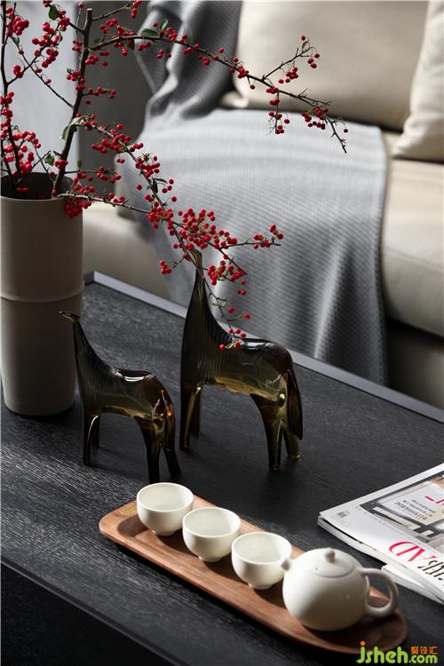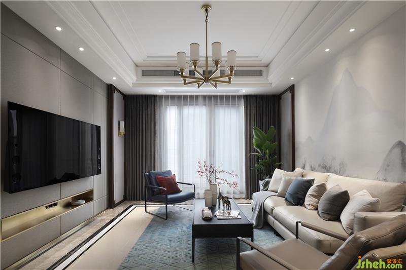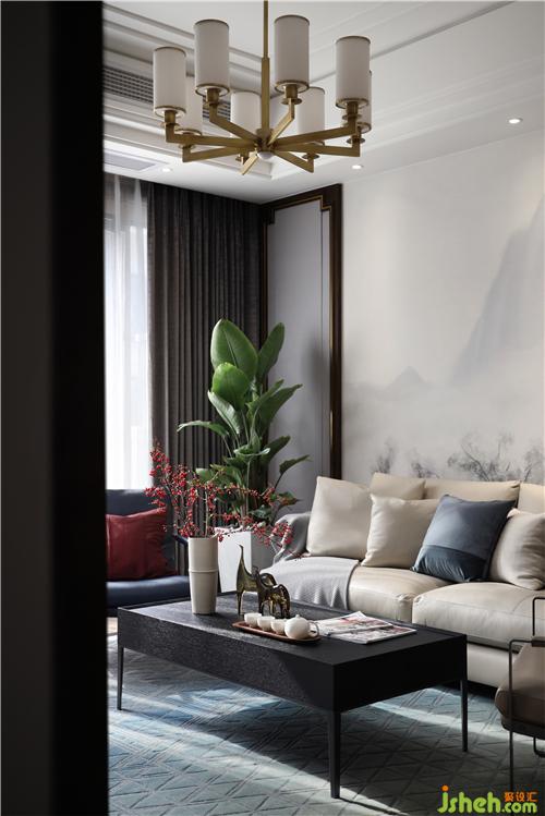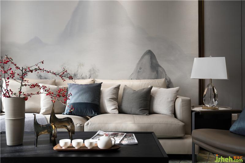 沙發(fā)背景大幅定制層層疊山,透出自然氤氳氣息,營(yíng)造出景深豐富、文雅詩(shī)意之感。