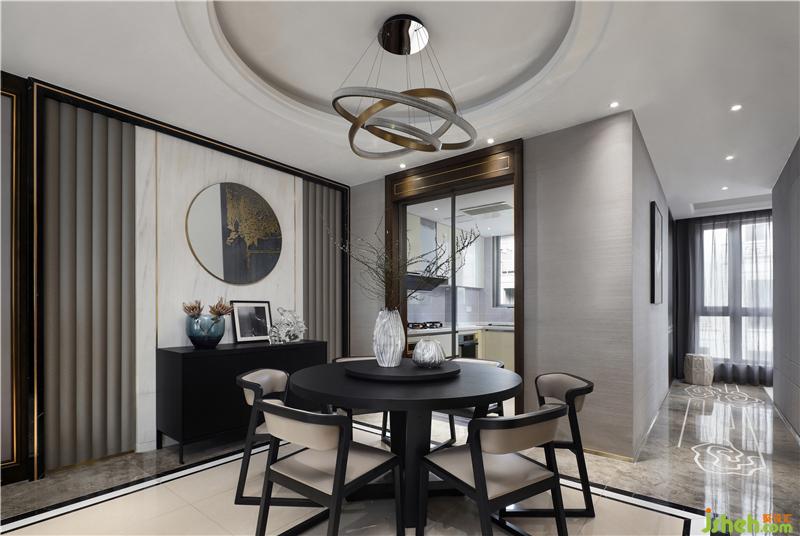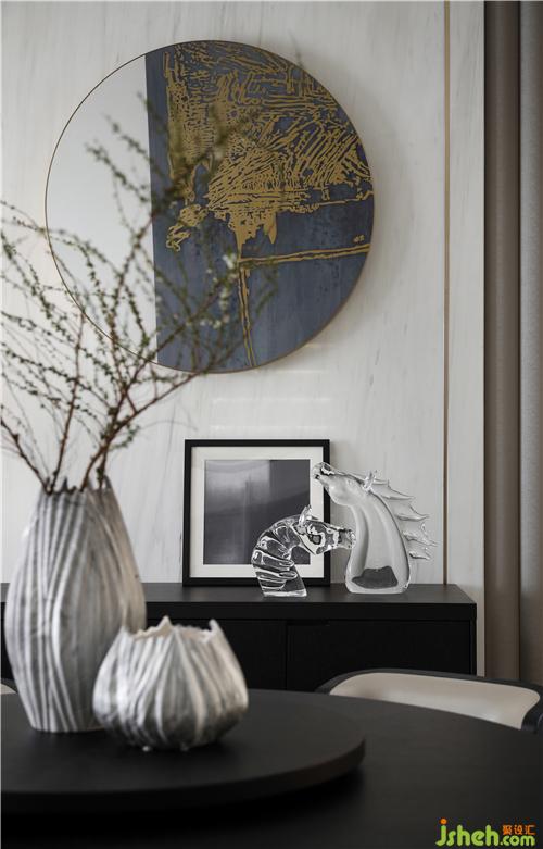 入戶玄關(guān)L型過(guò)道形成視覺(jué)交點(diǎn)。山水格柵的儲(chǔ)物柜門,地面灰白相間的大理石地磚與舒展的云型圖案。拓寬視覺(jué)的同時(shí),豐富了空間層次,當(dāng)代與傳統(tǒng)融合共鳴,演繹空間的靈動(dòng)美。