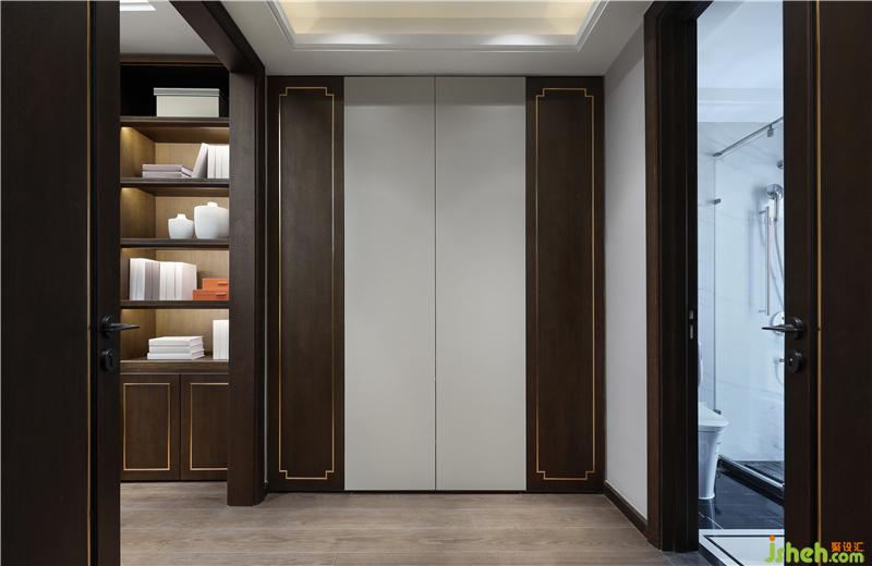 推開(kāi)主臥的雙開(kāi)大門,便是玄關(guān)兼衣帽間。正面四扇按壓式開(kāi)啟的柜門,中間兩扇純白,兩邊的是咖影木飾面鑲香檳金,兼具柜門功能,又與整體設(shè)計(jì)相呼應(yīng),成為獨(dú)特的玄關(guān)端景。