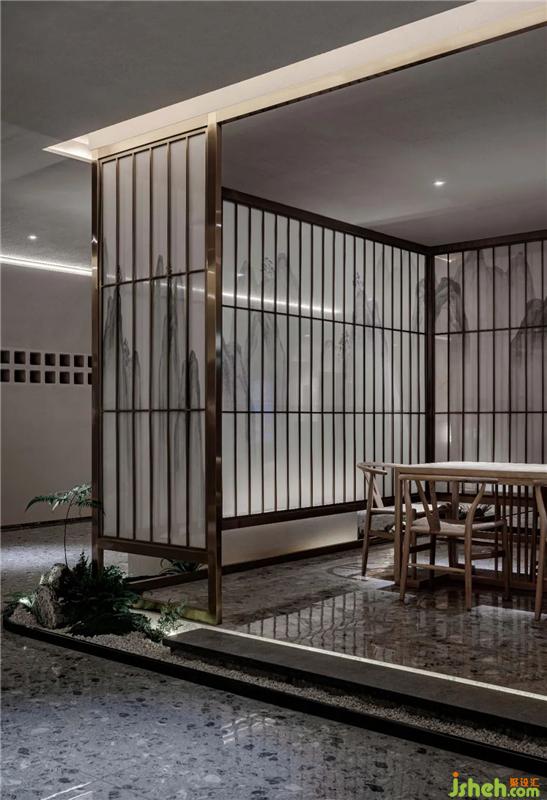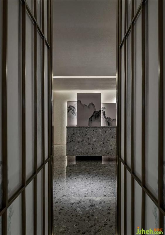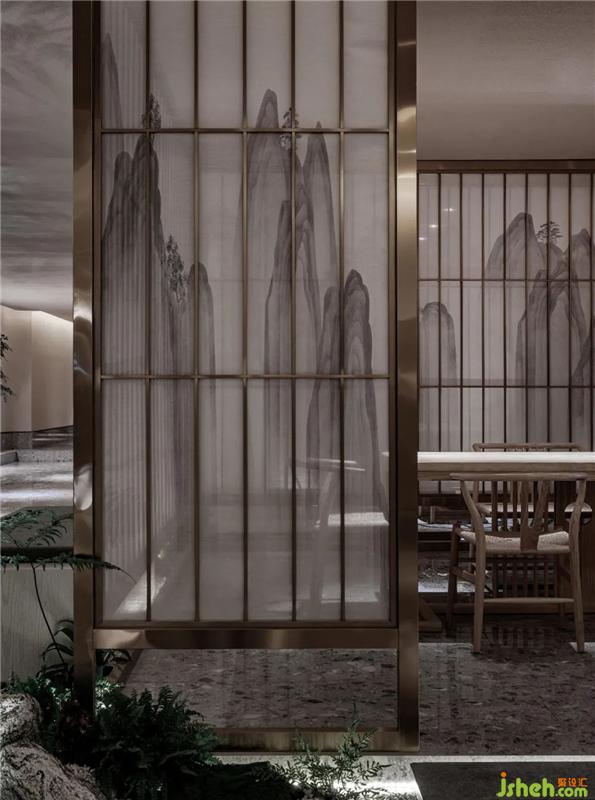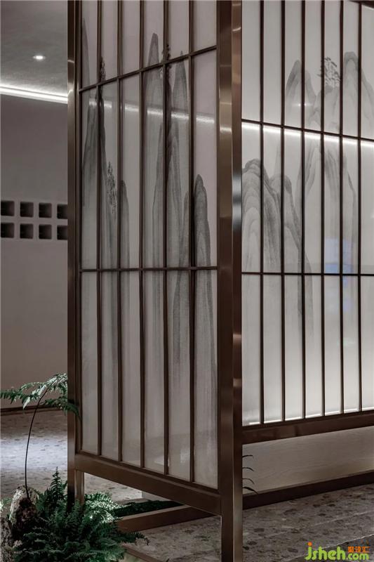 首先步入室內(nèi)映入眼簾的是一排陣列有序的水墨山水絹紗不銹鋼格柵,與其邊上的微景觀前后遙相輝映,若隱若現(xiàn)的表現(xiàn)手法讓訪客們對(duì)后面的空間產(chǎn)生了無(wú)限遐想福州養(yǎng)生館設(shè)計(jì)。