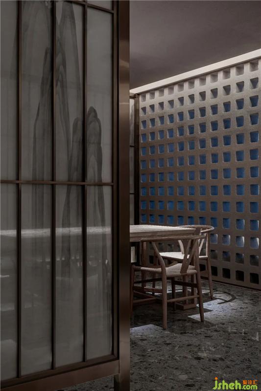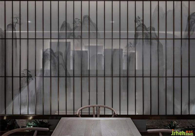 接待區(qū)的背景墻造型設(shè)計(jì)師將東方氣勢(shì)磅礴的山脈記憶融入于此,從“形”升華至“意”,讓自然元素與Three Yard很好的融合在一起,建立了很強(qiáng)的共生關(guān)系。遠(yuǎn)處的品茶區(qū)兼容東方美學(xué)與現(xiàn)代主義的設(shè)計(jì)法則,將無(wú)數(shù)根線條與白色的水墨山水絹紗貫穿融合,將城市的喧鬧嘈雜在清雅的場(chǎng)景中“自然化”。