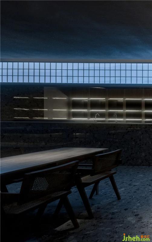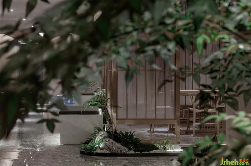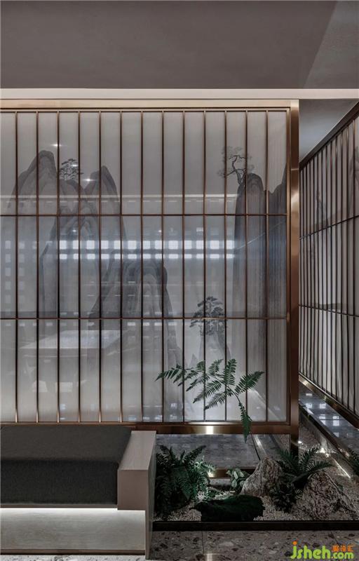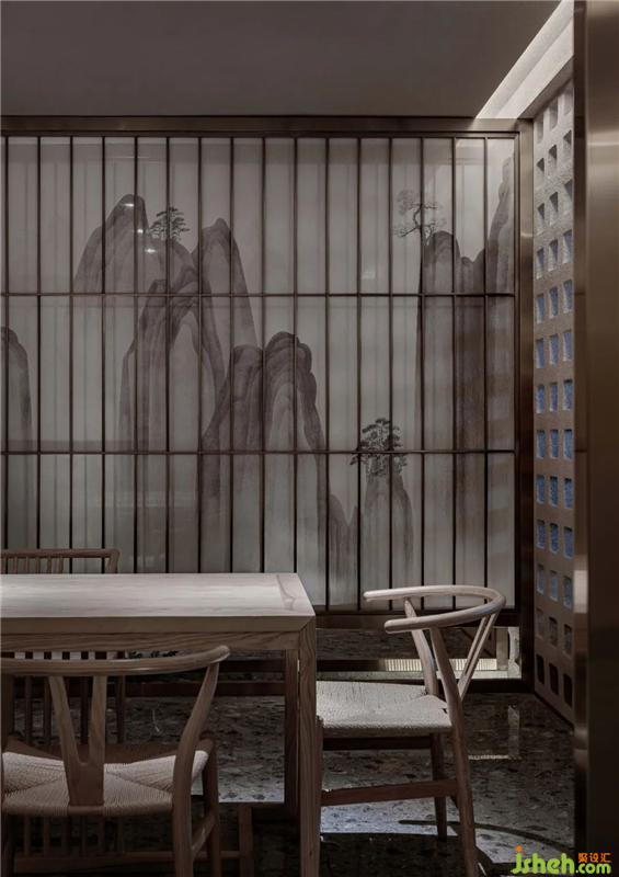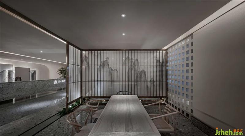 隨之撲面而來(lái)的是設(shè)計(jì)中以當(dāng)代手法將山水、自然和光影結(jié)于一庭,整個(gè)空間由一幅美輪美奐的長(zhǎng)廊絹紗定制的水墨山水畫卷串聯(lián)起來(lái),經(jīng)典的符號(hào)、現(xiàn)代的工藝、清雋簡(jiǎn)潔的藝術(shù)與文人雅士的生活場(chǎng)景交疊融合,寥寥數(shù)筆,東方的清雅與靈逸緩緩而入。
