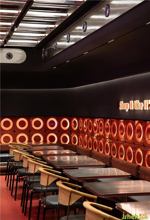 YEAP LAB將主理人身上散發(fā)的“street young soul”氣質(zhì)移情到空間設(shè)計,顛覆傳統(tǒng)粉店的思路,以“迪廳”主題釋義空間故事。年輕、時尚、新潮,喚起無限活力。杭州餐廳設(shè)計釋放想象力與創(chuàng)造力的同時,恰好開啟“白天Pho晚上酒”的用餐模式。這是基于品牌文化基因傳達(dá)的深層考慮,也是預(yù)測未來商業(yè)狀態(tài)的一種前瞻察覺力。