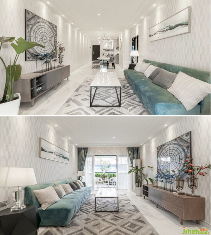 作為文藝復(fù)興的發(fā)源地,意大利對藝術(shù)的呈現(xiàn)多元且風雅,在A 戶型的設(shè)計中,教堂圓頂壁畫與山水墨畫就是極為巧妙的搭配。在室內(nèi)設(shè)計師的創(chuàng)作中,也會體現(xiàn)出內(nèi)斂愜意的意式魅力,不過不同于藝術(shù)的古典, 整體設(shè)計上,是更具年輕活力與時尚大氣的,幾何墻面與低碳、清新的墨綠沙發(fā)、純實木家具系列、綠植擺飾所呈現(xiàn)的就是如此。