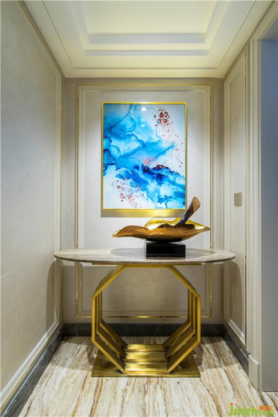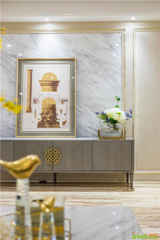 生活中的雅致與浪漫是主人一直推崇的一種生活放式,全房地面采用大理石材質(zhì),石材的光澤填補(bǔ)了本戶型自然采光不足的缺失,墻板的木質(zhì)肌理搭配金色銅條,視覺上恰到好處的營造出精致時(shí)尚的優(yōu)雅魅力。裝修公司