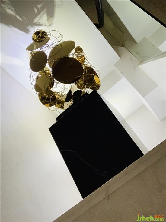 整個空間沒有多余的繁雜造型,絲絨單椅的色彩點綴在燈光的烘托下,讓原本不高的空間層次變得鮮明?;齑畹牟妓嚥鸵魏秃啙嵤牟妥?,明亮又溫暖的色澤讓空間充滿了鮮活的氣息,為平淡的生活增添了一份溫暖,一絲靈動。幾何設計、色彩和鑲嵌藝術是精致優(yōu)雅風格必備,無論是在現(xiàn)代或傳統(tǒng),金色元素與大理石的完美搭配,碰撞出空間輕奢質感,也增加了其獨特的魅力。